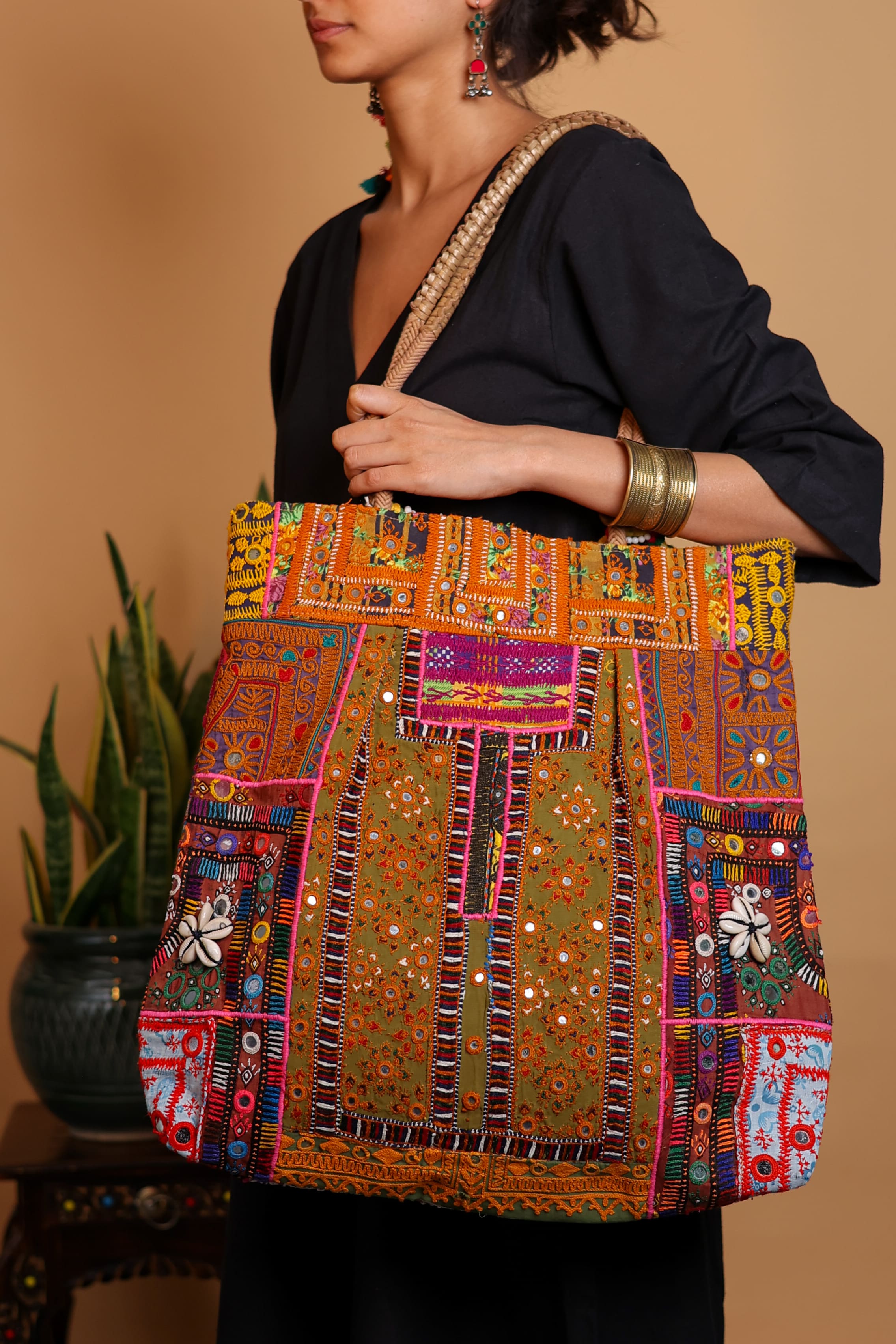 With this jumbo Banjara tote, you’ll feel the urge to play with your outfit and let the Banjaran in you take over. Each piece is one of a kind, carrying gentle imperfections like loose threads, missing mirrors, or faint blemishes — marks of true authenticity.