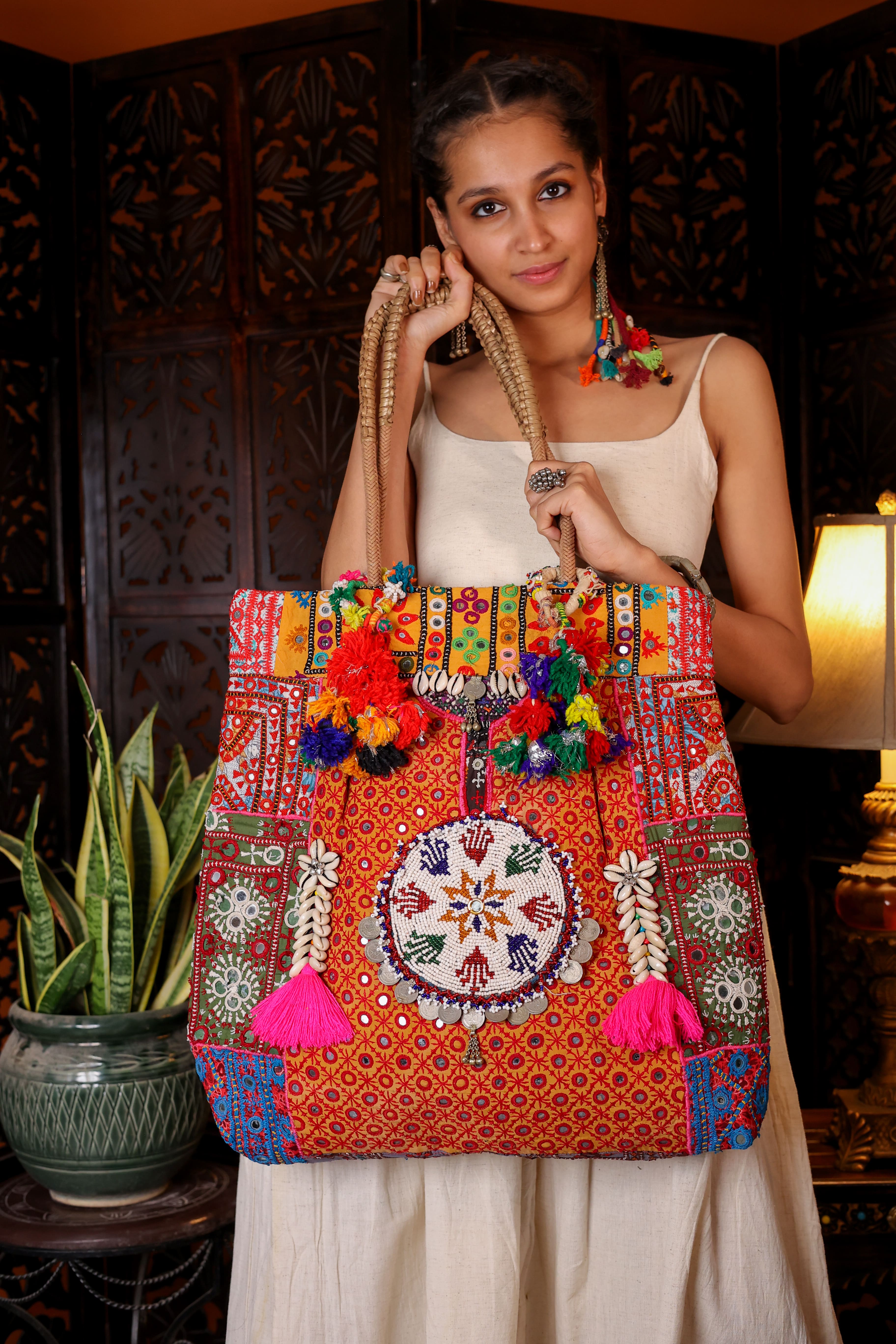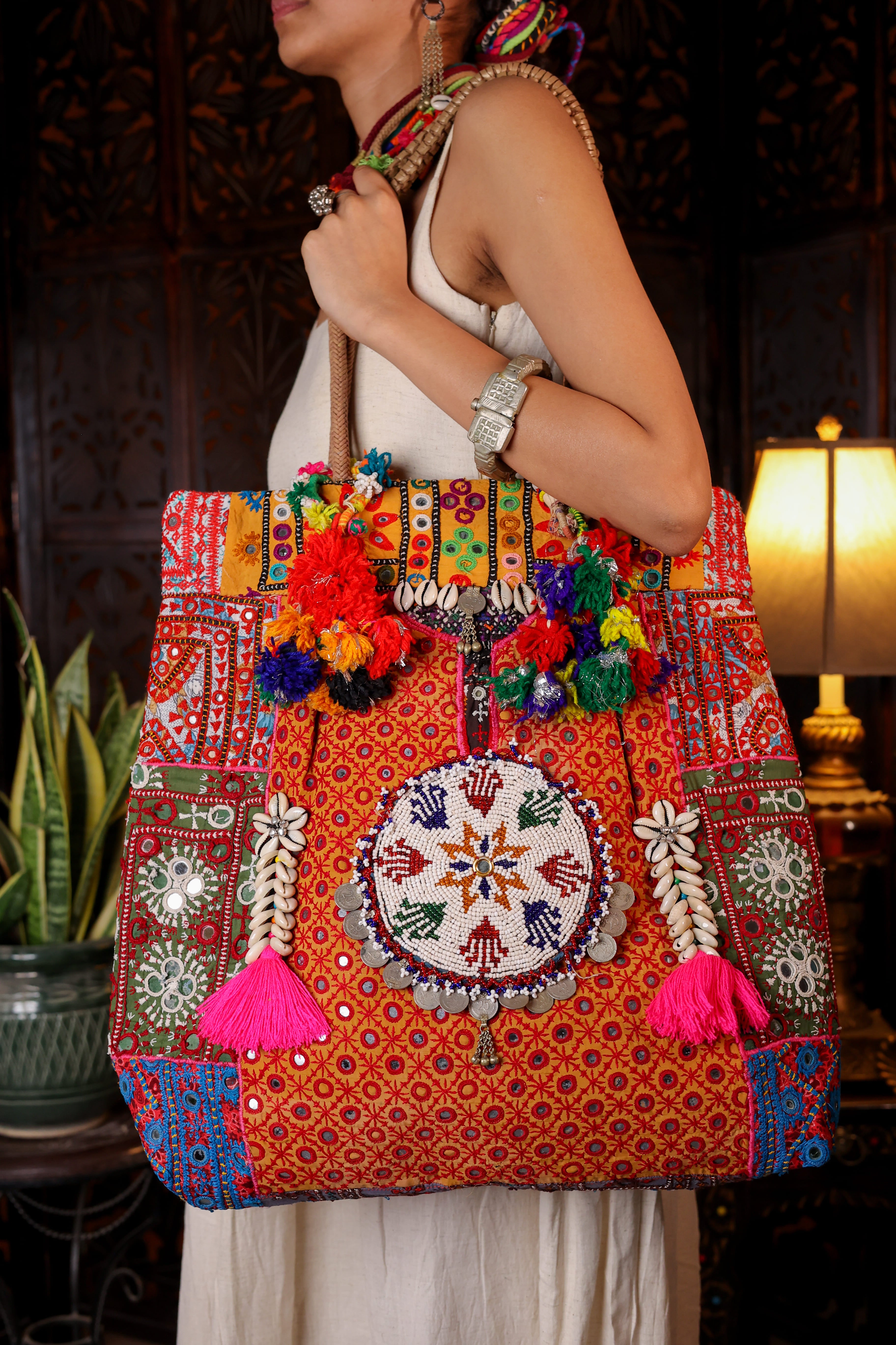 With this jumbo Banjara tote, you’ll feel the urge to play with your outfit and let the Banjaran in you take over. Each piece is one of a kind, carrying gentle imperfections like loose threads, missing mirrors, or faint blemishes — marks of true authenticity.