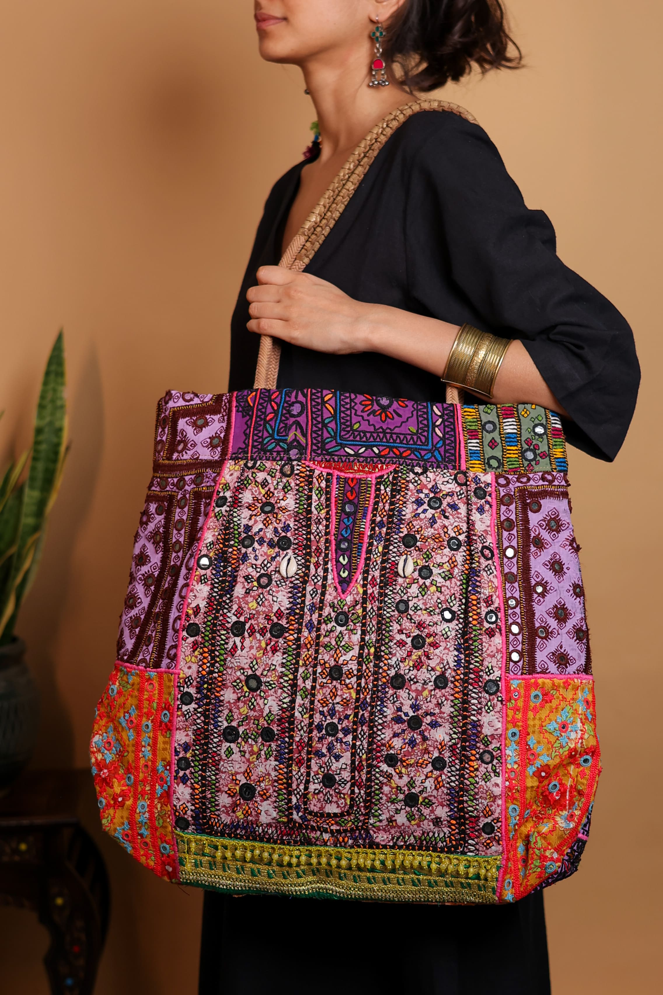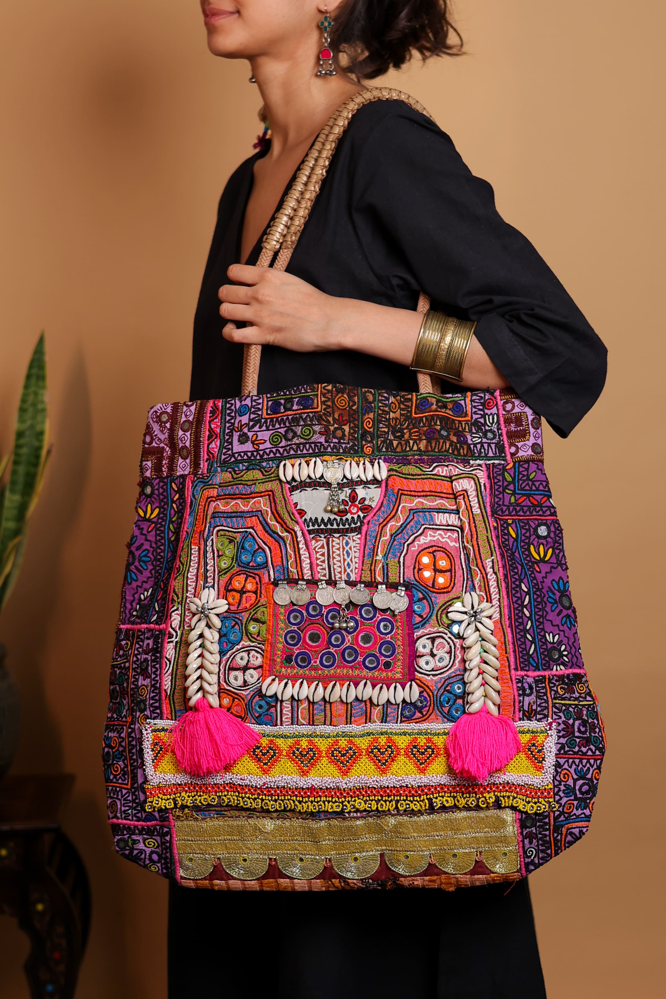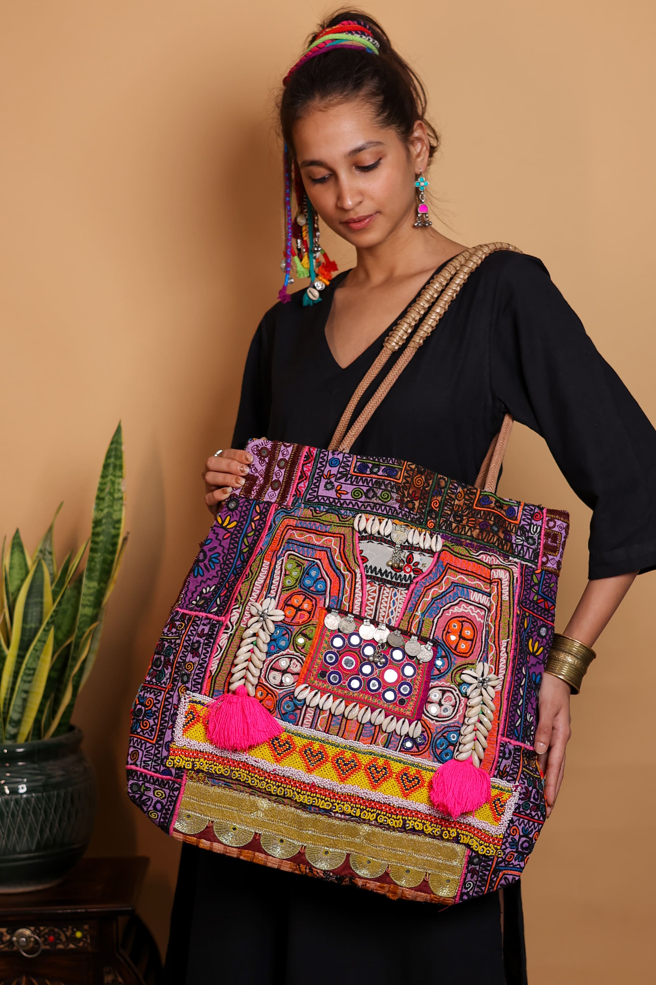 This spacious Banjara tote is an explosion of colour and craft. At its base are vintage Balochi yokes — beautifully embroidered fabrics that once adorned the colourful dresses of Balochi women. Layered onto this heritage are a Lambani mirror patch and a bold Afghani beaded rectangle, turning the bag into a canvas of design, detail, and creativity.