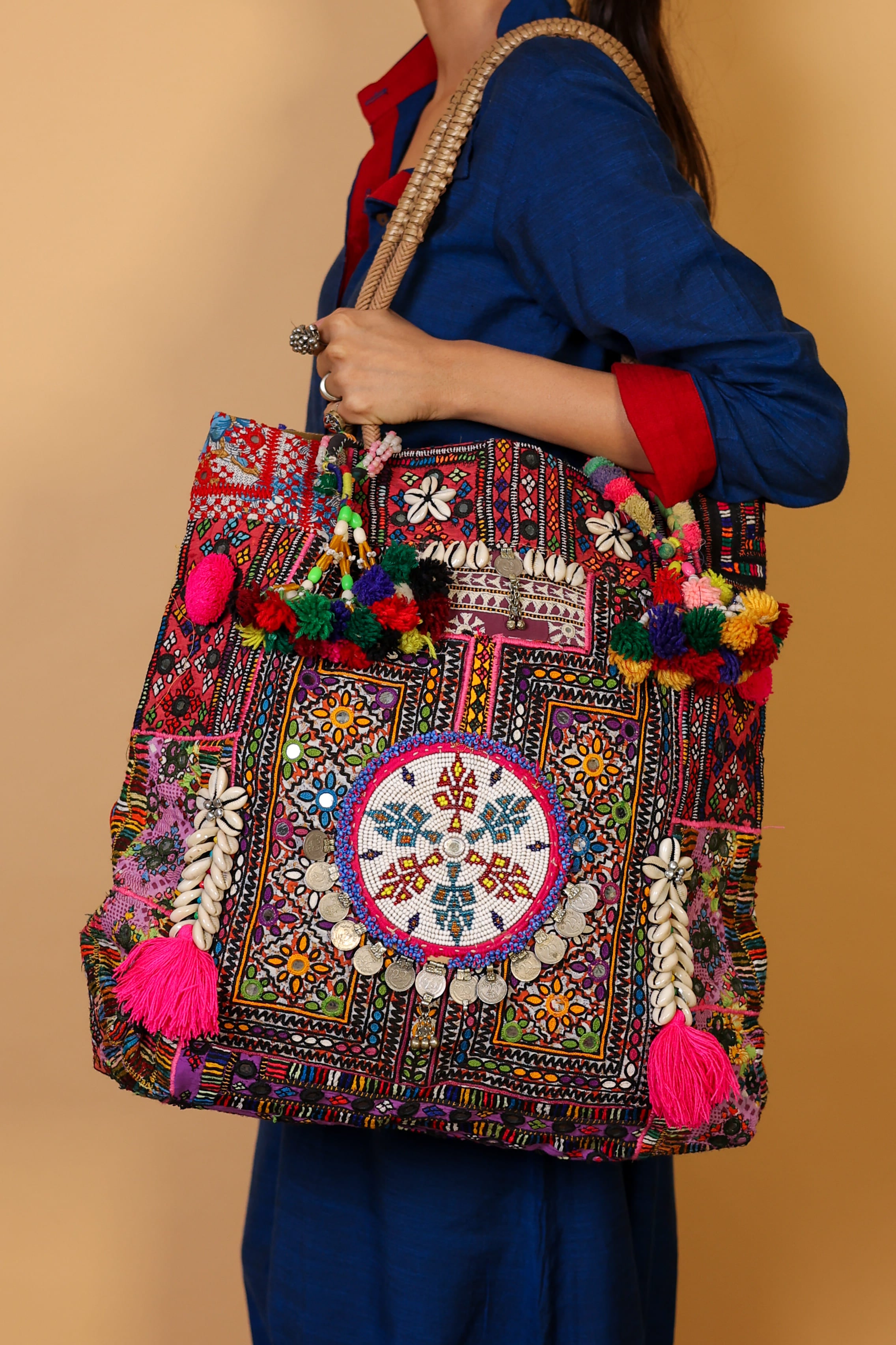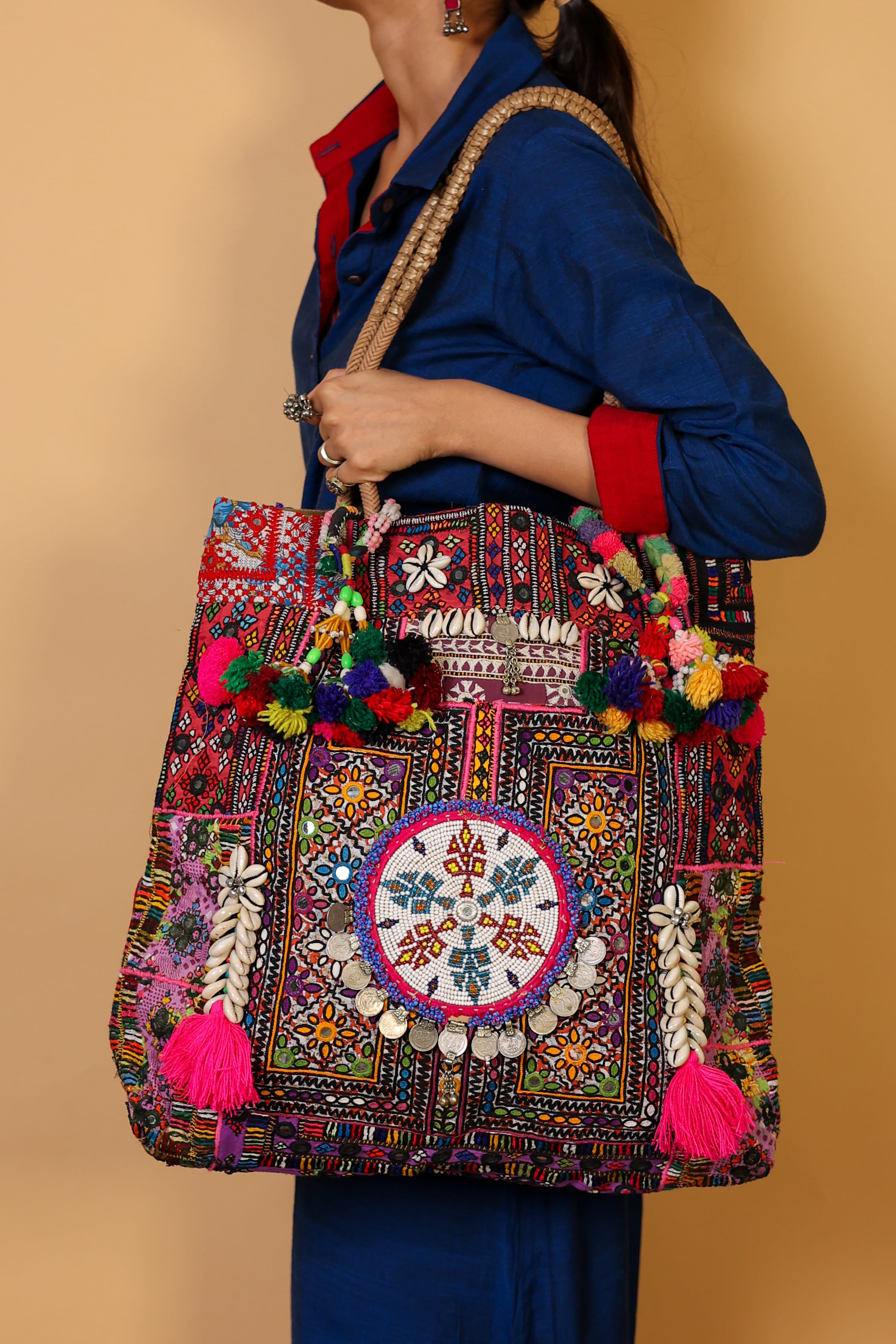 This spacious Banjara tote is an explosion of colour and craft. At its base are vintage Balochi yokes — beautifully embroidered fabrics that once adorned the traditional dresses of Balochi women. Crowned with an intricate circular Afghani beaded patch, it becomes a canvas of design, detail, and creativity.