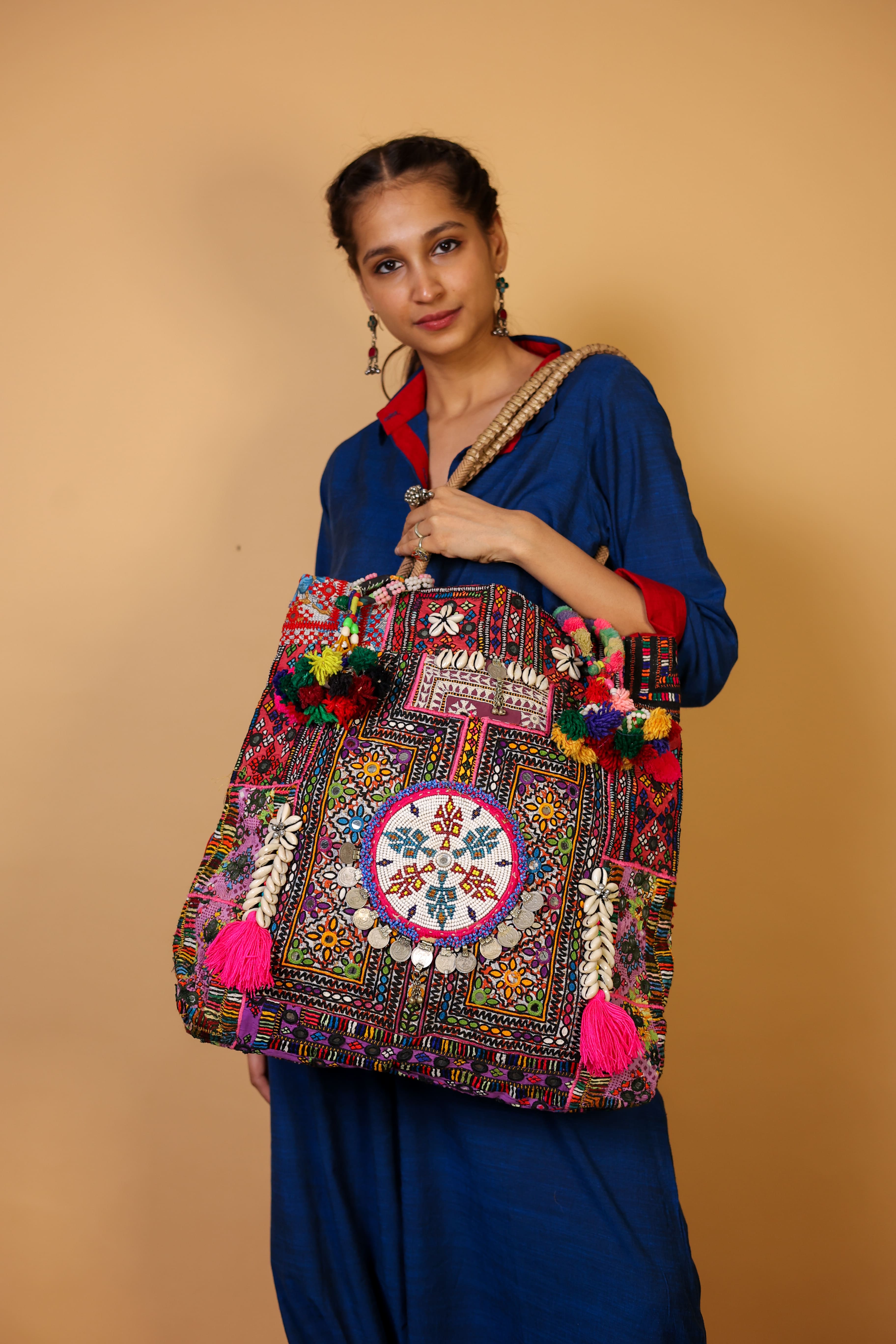 With this jumbo Banjara tote, you’ll feel the urge to play with your outfit and let the Banjaran in you take over. Each piece is one of a kind, carrying gentle imperfections like loose threads, missing mirrors, or faint blemishes — marks of true authenticity.