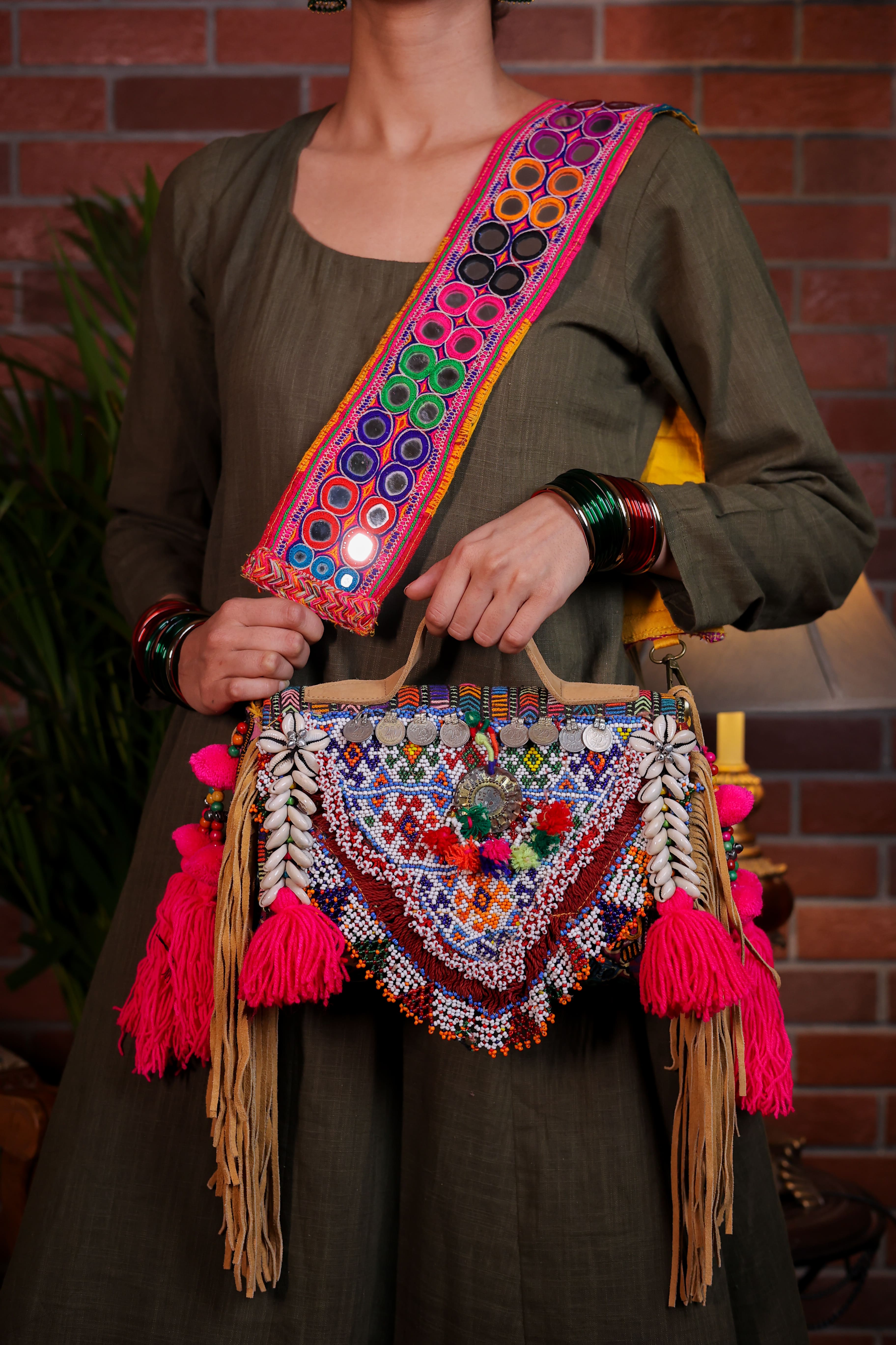 The Kohinoor Banjara bag is all about beadwork. The front is adorned with a large, intricate beaded patch sourced from Afghanistan, bursting with colour and detailed hand made patterns.  It rests on a base of upcycled Balochi yokes, rich with mirror work and vibrant embroidery.